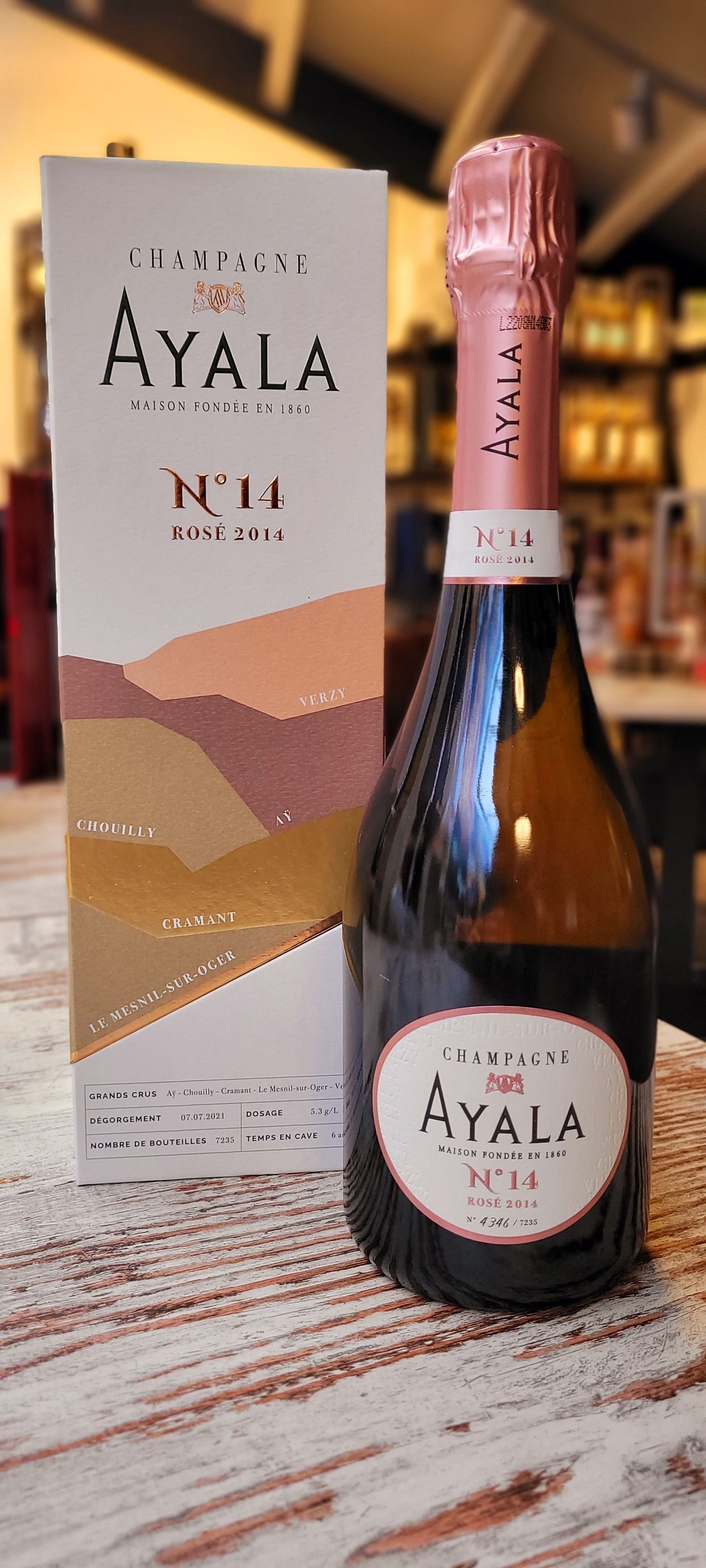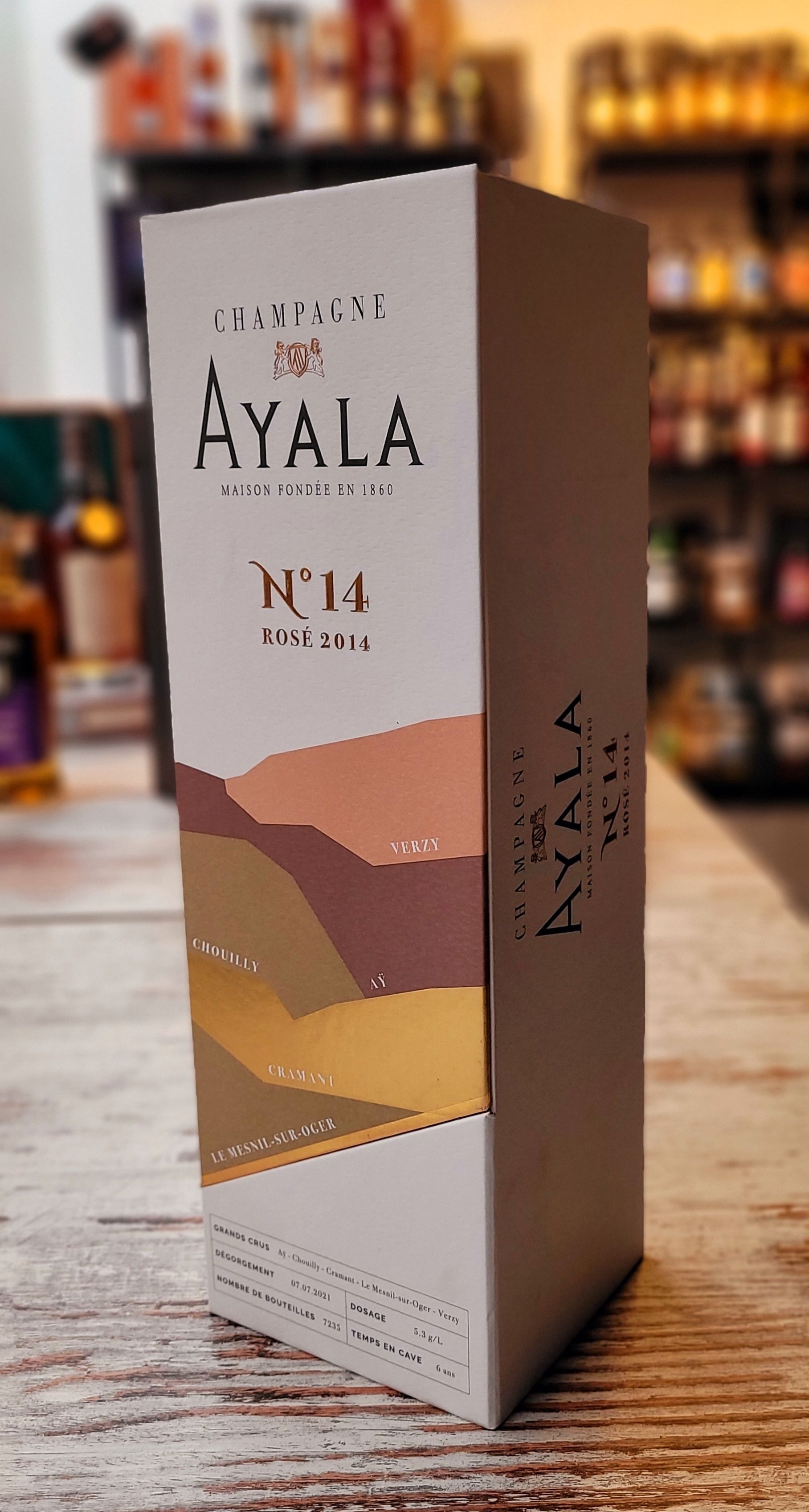 Ayala N° 14 Rosé 2014 is een unieke limited edition Champagne. Uitzonderlijk verfijnde champagne en met een bijzondere aromatische complexiteit, zijdezachte structuur en stuit af met een krachtige lange afdronk. Deze Rosé Champagne is samengesteld uit de vijf Grands Crus die de ruggengraat vormen van de melanges van het Ayala huis. Uitsluitend vanaf de 2014 vintage en voor het eerst in een rosé uitvoering met slechts 7235 flessen.