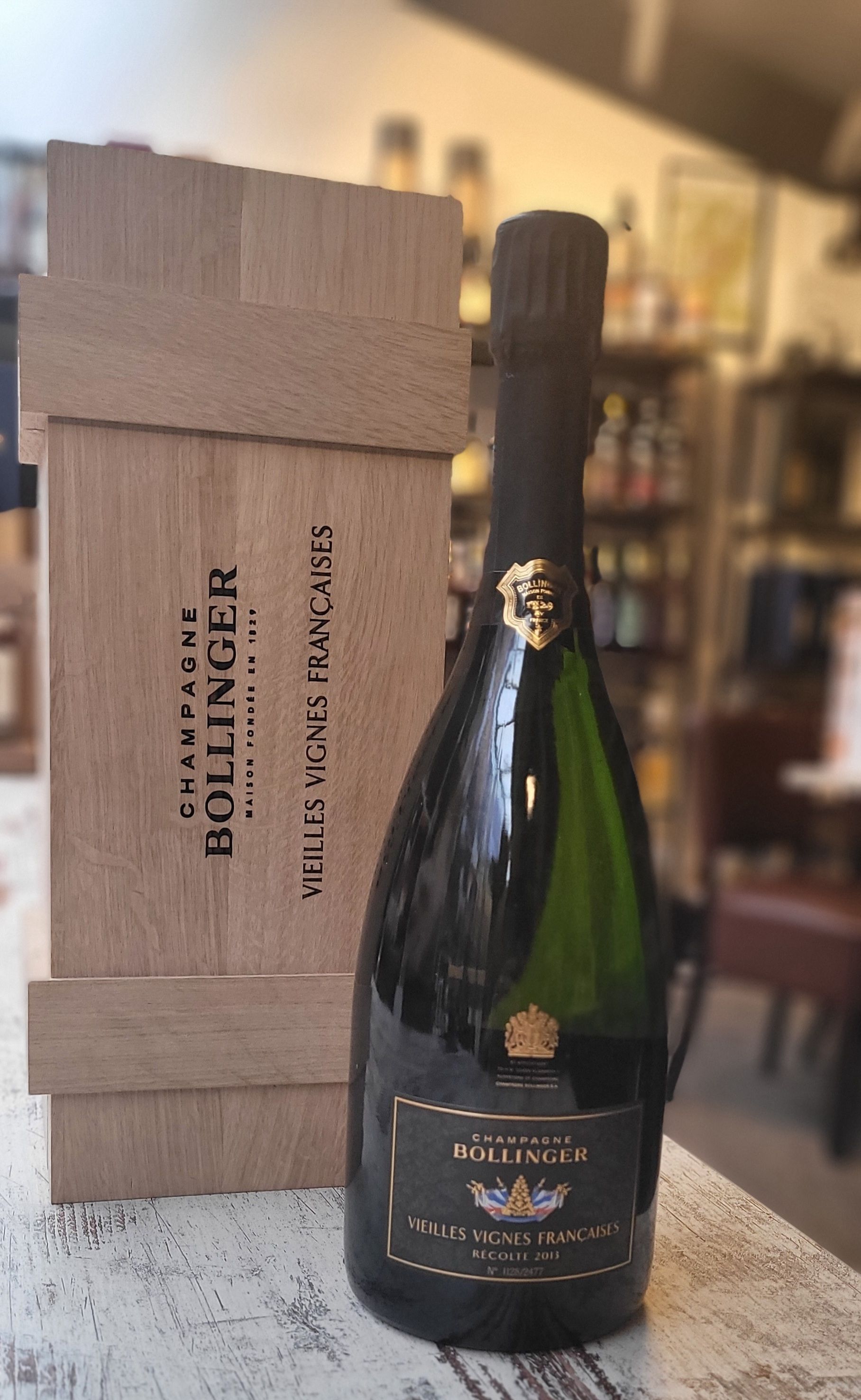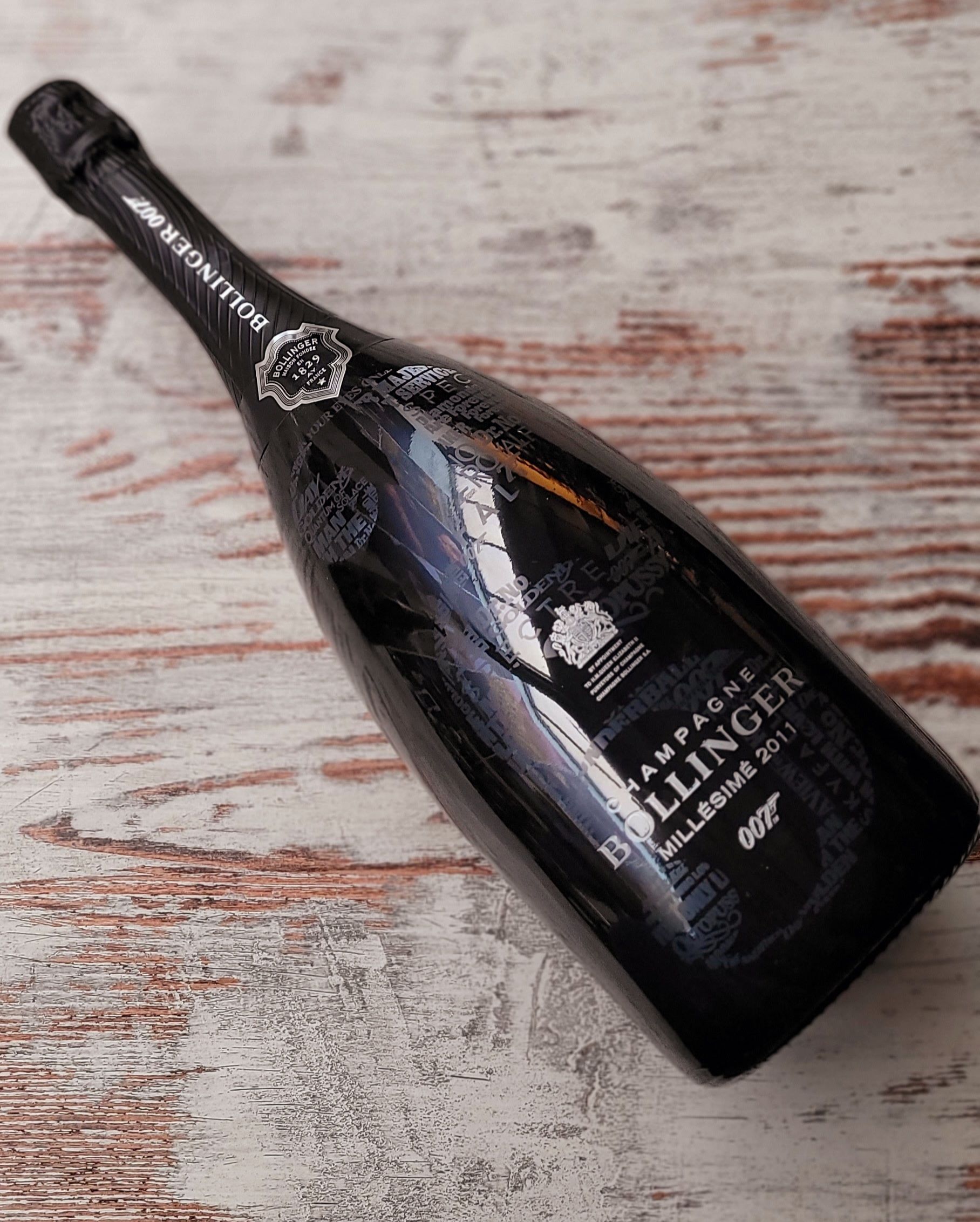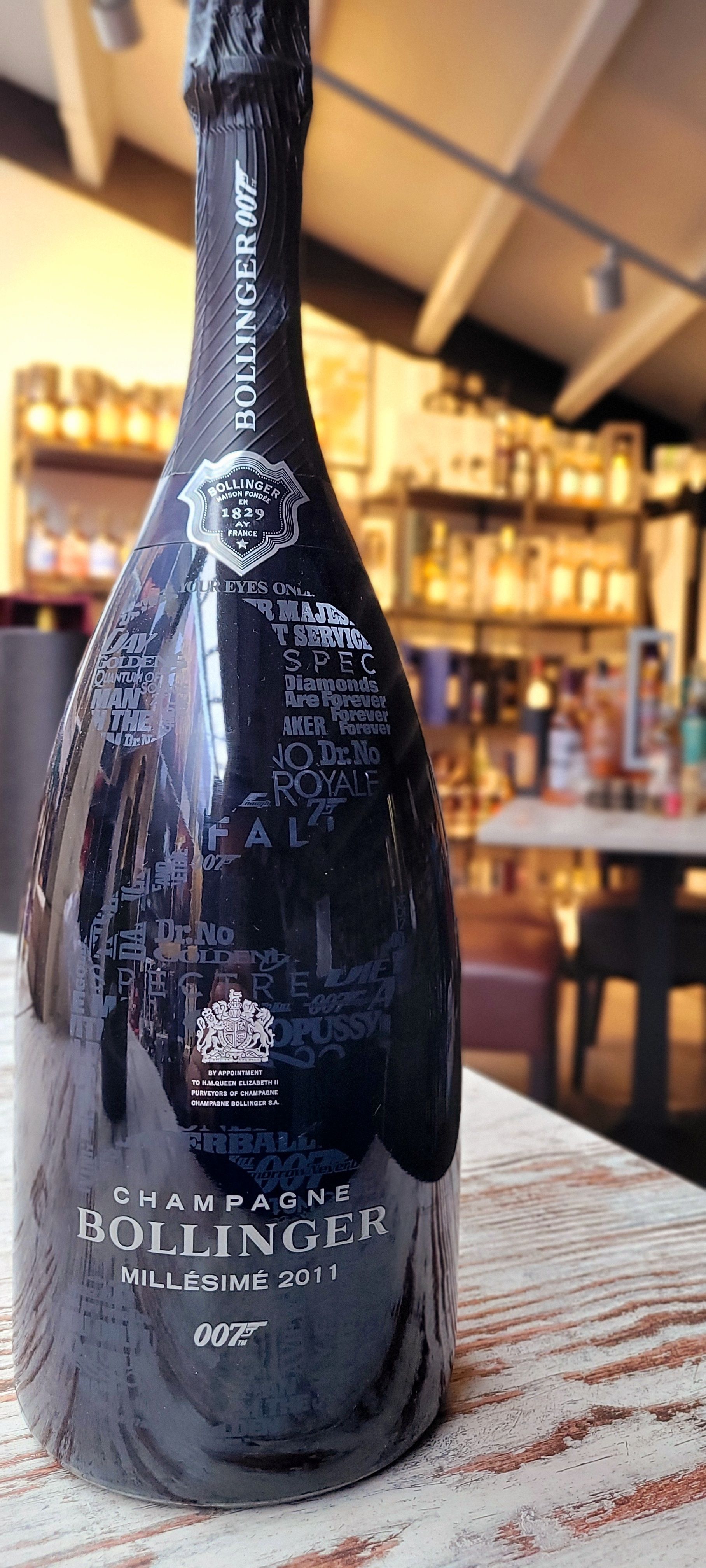 Bollinger Millésimé 2011 Magnum 1,5L. Bollinger bracht deze parel op de markt naar aanleiding van de lancering van de 25e Bond film "No Time To Die" Het is een 100% Pinot Noir uit de Grand Cru wijngaarden van het dorpje Ay.
