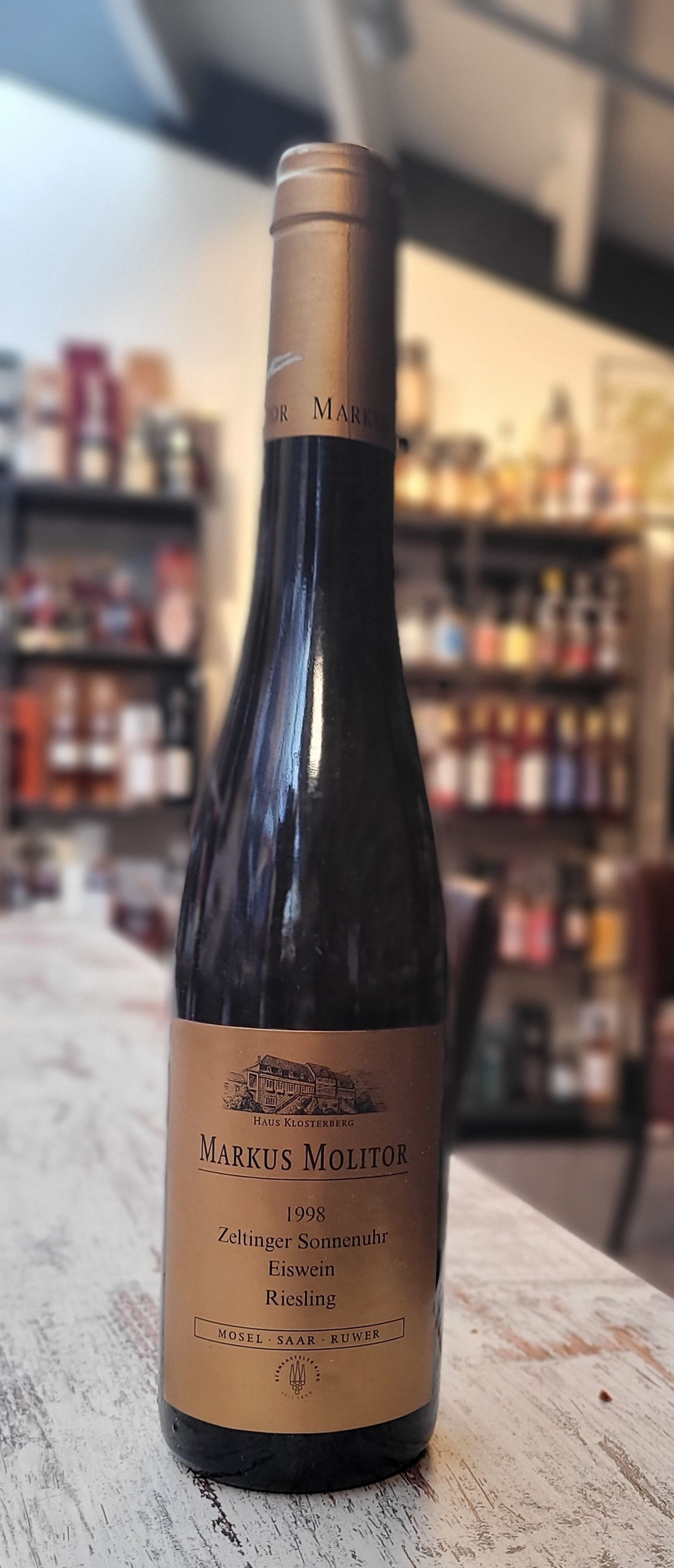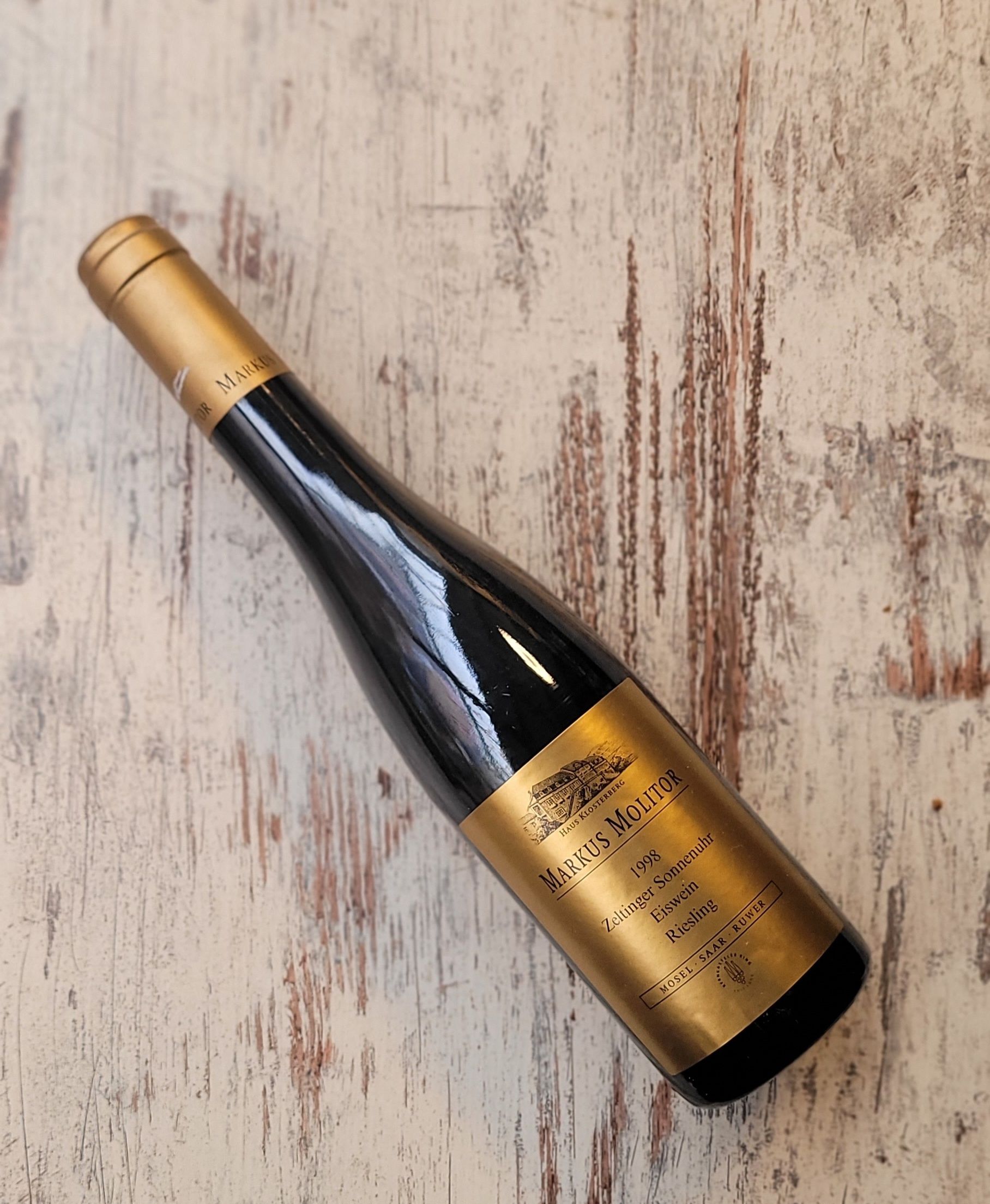 Markus Molitor Zeltinger Sonnenuhr Eiswein 1998. IJswijn wordt gemaakt van bevroren druiven. De druiven blijven aan de ranken hangen totdat het -7 of -8 is. Bij deze temperatuur is het water in de druif gekristalliseerd en het pure druivensap nog vloeibaar. De oogst vindt midden in de nacht plaatst. Deze wijn is daardoor zeer zeldzaam, heerlijk zoet, complex en rijk. Markus Molitor bezit de beste wijngaarden in de Mosel. 37,5cl