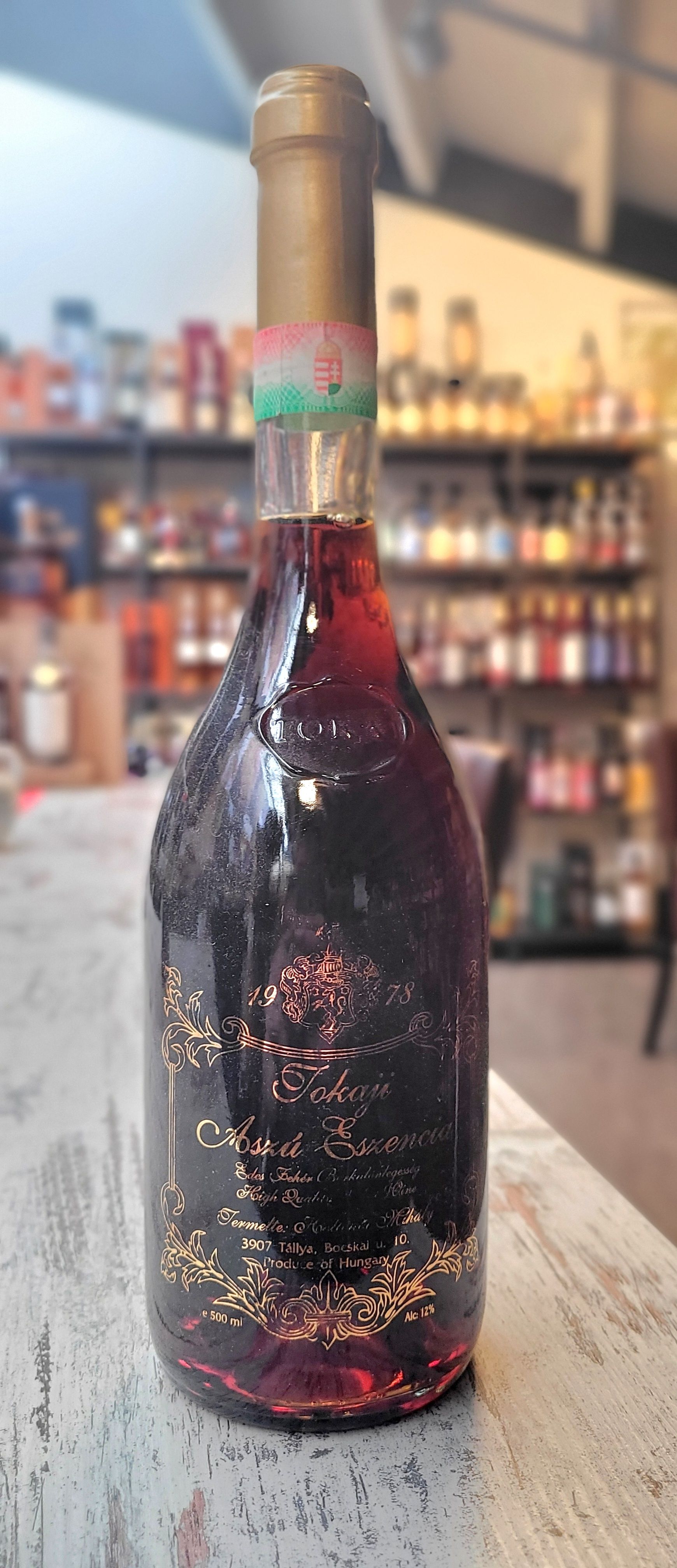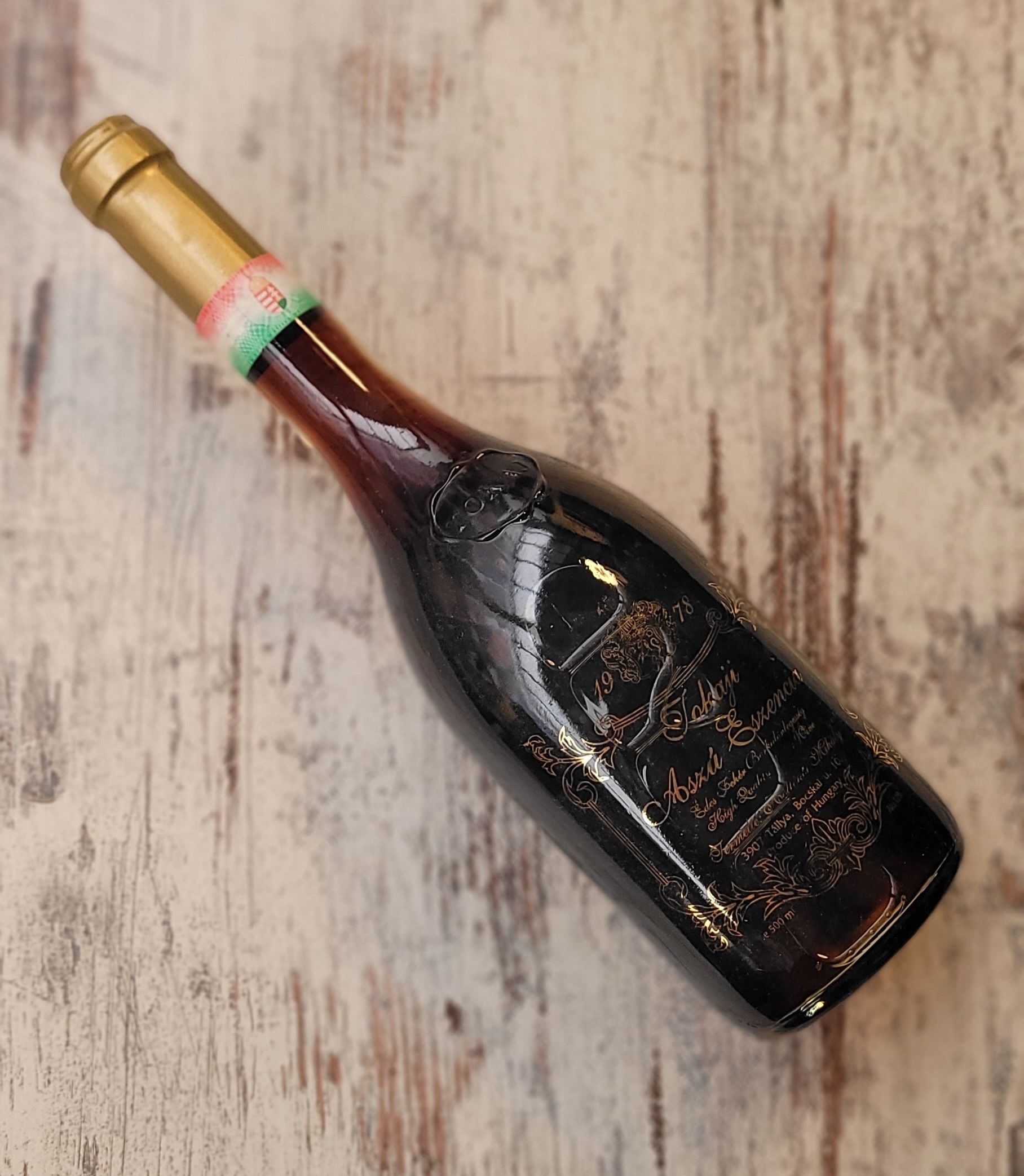 Hollókői Mihály Eszencia 1978. Eszencia is de meest zeldzame Tokaji. Ook één van de meest dure wijnen op aarde. De met de hand geoogste Aszu druiven worden voor een aantal dagen verzameld in een vat. Door het eigen gewicht van de druiven verzamelt zich hoog geconcentreerde sap op de bodem van het vat. Dit is het sap waar de Tokaji Eszencia van wordt gemaakt. 50cl